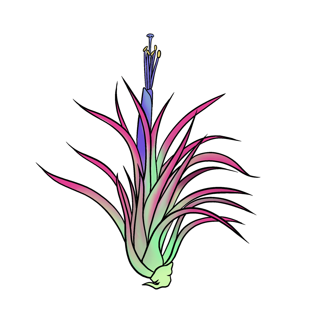 Air plants bloom one time in their life. Most air plants blooms' have purple petals. The amount of flower bracts and length of bloom stalk depends on the species. Pollinators such as hummingbirds, bees, butterflies and moths travel between the blooming plants.